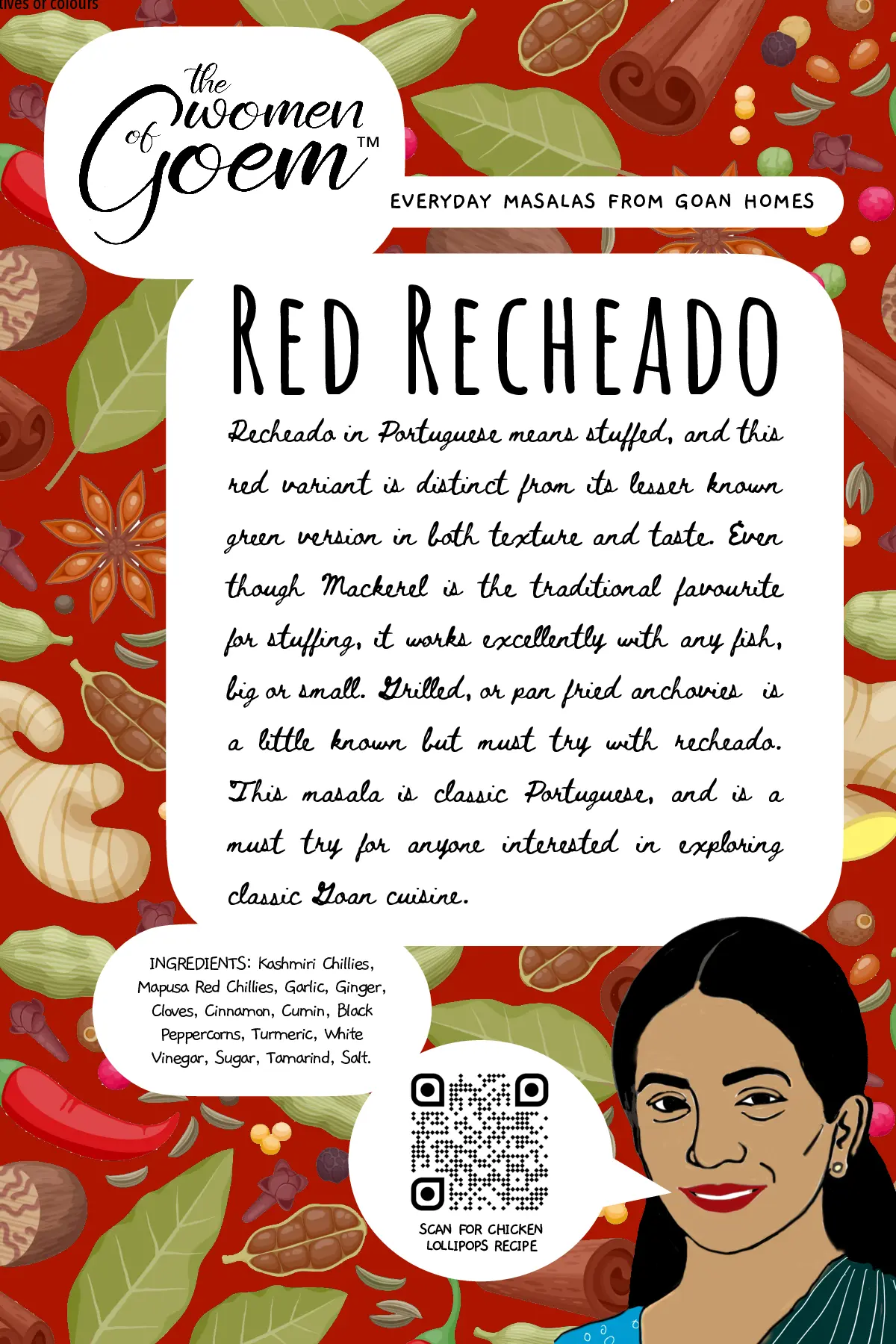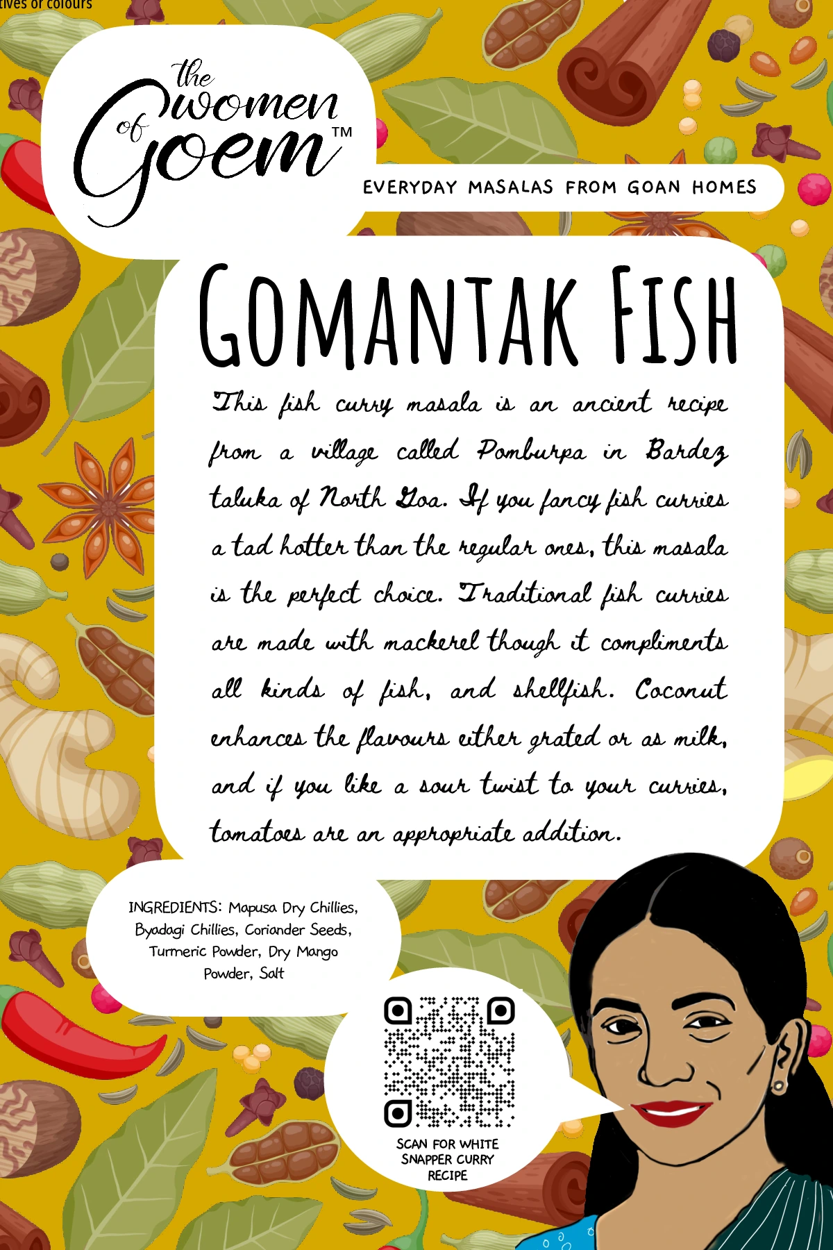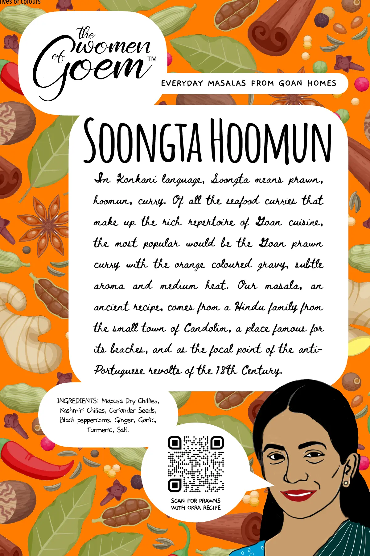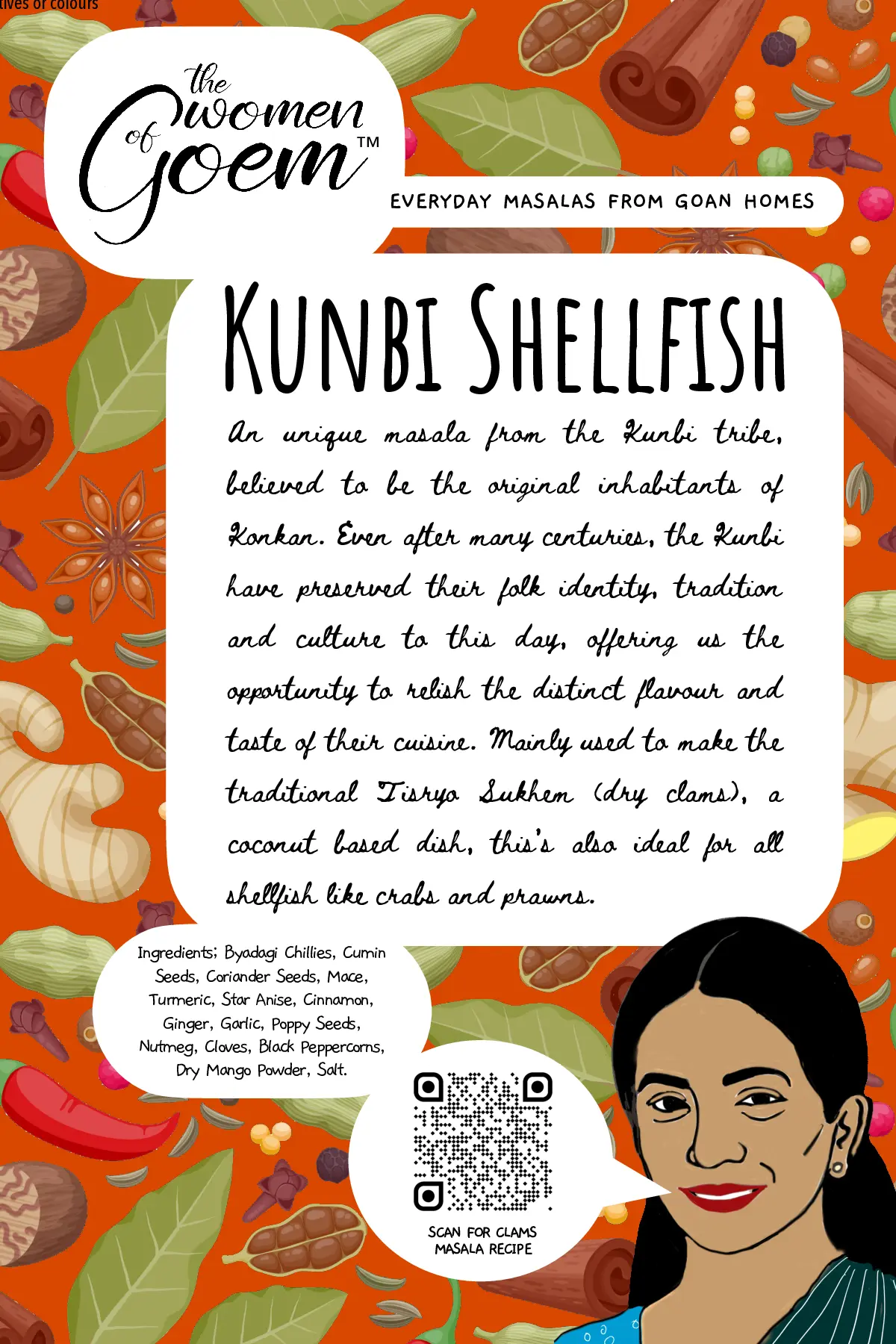 When it comes to cooking tisryo (clams) or kurlya (crabs), perhaps nothing could beat this masala, a traditional classic from the Kunbi tribe – believed to be the original inhabitants of Konkan. This ancient masala recipe is from the community based in Salsette, another name for South Goa. Even after many centuries, they have kept their folk identity, tradition and culture to this day, offering us the opportunity to relish the distinct flavour and taste of their cuisine. This masala though traditionally used for shellfish, compliments other types of seafood as well.